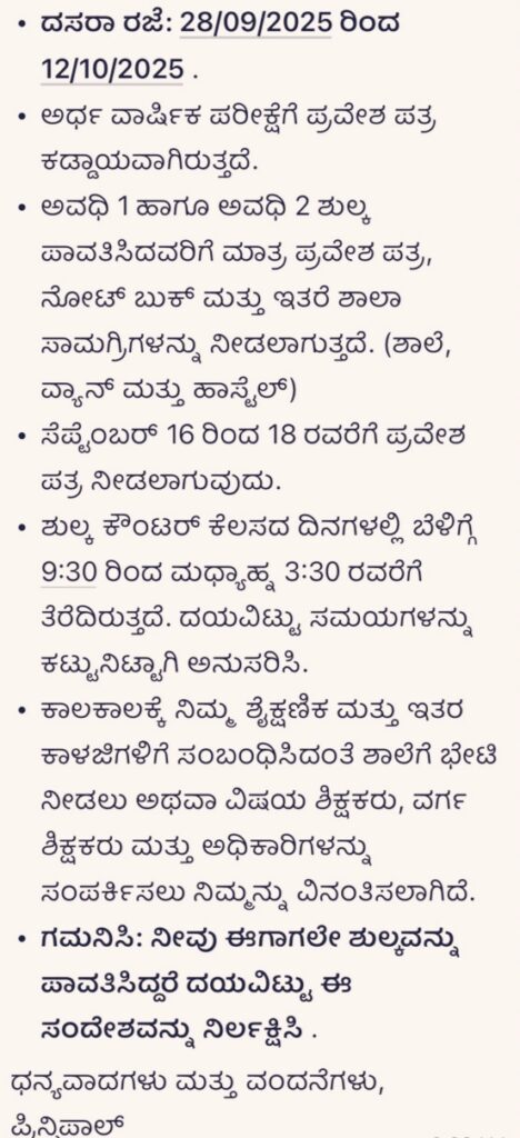 ಈಗಾಗಲೇ ಶಾಲೆಯ ಮಧ್ಯಂತರ ಅವಧಿ ಮುಕ್ತಾಯದ ಹಂತ ತಲುಪಿದ್ದು ಇನ್ನೇನು ಪರೀಕ್ಷೆ ನಡೆಯಲಿವೆ. ಆದರೆ ಮುಂಬರುವ ಅವಧಿಯ ಶುಕ್ಕ ಕಟ್ಟಿದರೆ ಮಾತ್ರ ಮಕ್ಕಳ ಪರೀಕ್ಷೆಗೆ ಅವಕಾಶ ನೀಡಲಾಗುತ್ತದೆ ಇಲ್ಲವಾದರೆ ಮಕ್ಕಳಿಗೆ ಯಾವುದೇ ರೀತಿಯಲ್ಲಿ ಪರೀಕ್ಷೆಗೆ ಅವಕಾಶ ನೀಡಲು ಸಾಧ್ಯವಿಲ್ಲ ಎಂದು ಸಾಯಿನಿಕೇತನ ಶಿಕ್ಷಣ ಸಂಸ್ಥೆ ಆಡಳಿತ ಮಂಡಳಿ ಕಟ್ಟಪ್ಪಣೆ ಹೊರಡಿಸಿದೆ.