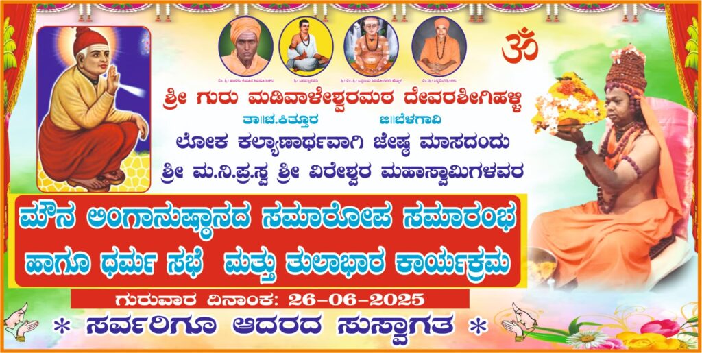 ಕಳೆದ ಮೇ. 28 ರಿಂದ ಶ್ರೀಗಳು ಮೌನ ಲಿಂಗಾನುಷ್ಠಾನ ಕೈಗೊಂಡಿದ್ದಾರೆ. ಗುರುವಾರ ಬೆಳಿಗ್ಗೆ 10 ರಿಂದ ತಾಲೂಕಿನ ದೇವರಶೀಗಿಹಳ್ಳಿ ಗ್ರಾಮದ ಗುರು ಮಡಿವಾಳೇಶ್ವರ ಮಠದಲ್ಲಿ ಮೌನ ಲಿಂಗಾನುಷ್ಠಾನದ ಸಮಾರೋಪ ಸಮಾರಂಭ ಹಾಗೂ ಧರ್ಮಸಭೆ ಮತ್ತು ತುಲಾಭಾರ ಕಾರ್ಯಕ್ರಮ ಜರುಗಲಿದೆ.