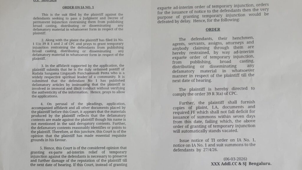 ಬೆಂಗಳೂರು : ಕೂಡಲಸಂಗಮದ ಲಿಂಗಾಯತ ಪಂಚಮಸಾಲಿ ಪೀಠದ ಪೀಠಾಧಿಪತಿಗಳಾದ ಶ್ರೀ ಬಸವ ಜಯಮೃತ್ಯುಂಜಯ ಸ್ವಾಮೀಜಿಯವರ (Kudalasangama Swamiji) ವಿರುದ್ಧ ಯಾವುದೇ ರೀತಿಯ ಮಾನಹಾನಿಕರ ಲೇಖನ ಅಥವಾ ದೃಶ್ಯಾವಳಿಗಳನ್ನು ಪ್ರಸಾರ ಮಾಡದಂತೆ ಬೆಂಗಳೂರಿನ 30ನೇ ಹೆಚ್ಚುವರಿ ಸಿಟಿ ಸಿವಿಲ್ ಮತ್ತು ಸೆಷನ್ಸ್ ನ್ಯಾಯಾಲಯವು ಮಧ್ಯಂತರ ತಡೆಯಾಜ್ಞೆ (Temporary Injunction) ನೀಡಿದೆ.