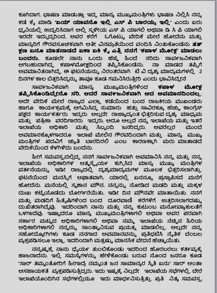 ಸಧ್ಯ ನಾರಾಯಣ ಬರಮನಿ ಬರೆದ ಸಮಗ್ರ ಪತ್ರದಲ್ಲಿ ಸಿಎಂ ಅವರಿಂದ ಆದ ಅವಮಾನದ ಕುರಿತು ಎಳೆ ಎಳೆಯಾಗಿ ಬಿಚ್ಚಿಟ್ಟಿದ್ದಾರೆ. ಇದರಿಂದ ಅವರ ಕುಟುಂಬಕ್ಕೆ ಆದ ಅವಮಾನ ಮತ್ತು ಸಾರ್ವಜನಿಕ ವಲಯದಲ್ಲಿ ಉಂಟಾದ ಮುಜುಗರವನ್ನು ಪತ್ರದಲ್ಲೇ ಬರೆದಿದ್ದಾರೆ.