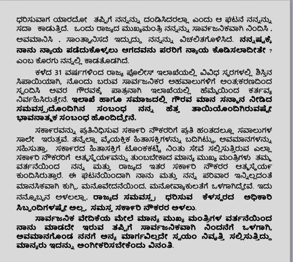 ಬೃಹತ್ ಸಾರ್ವಜನಿಕ ಸಭೆಯಲ್ಲಿ ಸಿಎಂ ಮಾಡಿದ್ದ ಅವಮಾನದಿಂದ ಬೇಸರಗೊಂಡ ಹೆಚ್ಚುವರಿ ಪೊಲೀಸ್ ವರಿಷ್ಠಾಧಿಕಾರಿ ನಾರಾಯಣ ಬರಮನಿ ಸ್ವಯಂ ಸೇವಾ ನಿವೃತ್ತಿ ಪಡೆಯಲು ಮುಂದಾಗಿದ್ದಾರೆ. ಆದರೆ ಇವರ ನಿವೃತ್ತಿ ಕೋರಿ ಬರೆದ ಪತ್ರದಿಂದ ಸರಕಾರಕ್ಕೆ ಸಾಕಷ್ಟು ಡ್ಯಾಮೆಜ್ ಉಂಟಾಗಿದೆ.