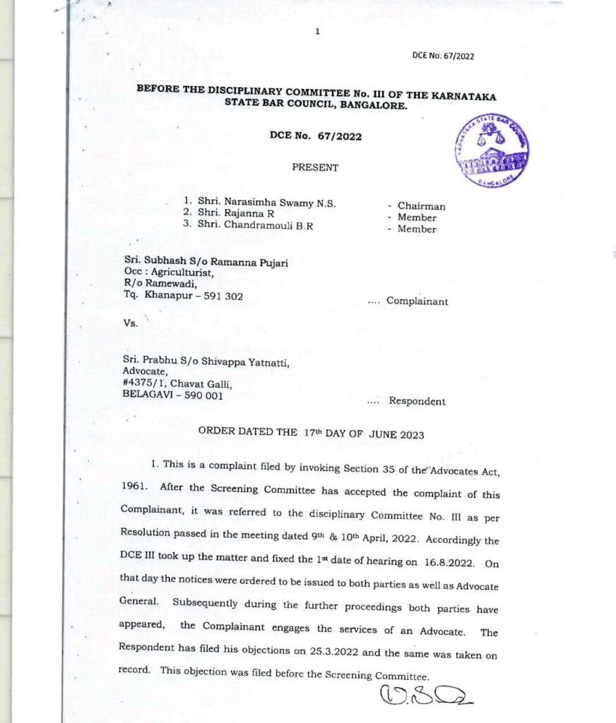 ಈ ಪ್ರಕರಣಕ್ಕೆ ಸಂಬಂಧಿಸಿದಂತೆ ರಾಜ್ಯ ವಕೀಲರ ಪರಿಷತ್ತಿನ ಶಿಸ್ತು ಸಮಿತಿಯು ತಪ್ಪಿತಸ್ಥ ವಕೀಲರ ಸನ್ನದು ಶಾಶ್ವತವಾಗಿ ರದ್ದುಗೊಳಿಸಿ, ಜೂ.19 ರಂದು ಆದೇಶ ಹೊರಡಿಸಿದೆ. ಬೆಳಗಾವಿ ಬಾರ್ ಅಸೋಸಿಯೇಷನ್ ಅಧ್ಯಕ್ಷ ಪ್ರಭು ಯತ್ನಟ್ಟಿ ವಂಚಿಸಿರುವ ಆರೋಪ ಎದುರಿಸುತ್ತಿರುವರು.